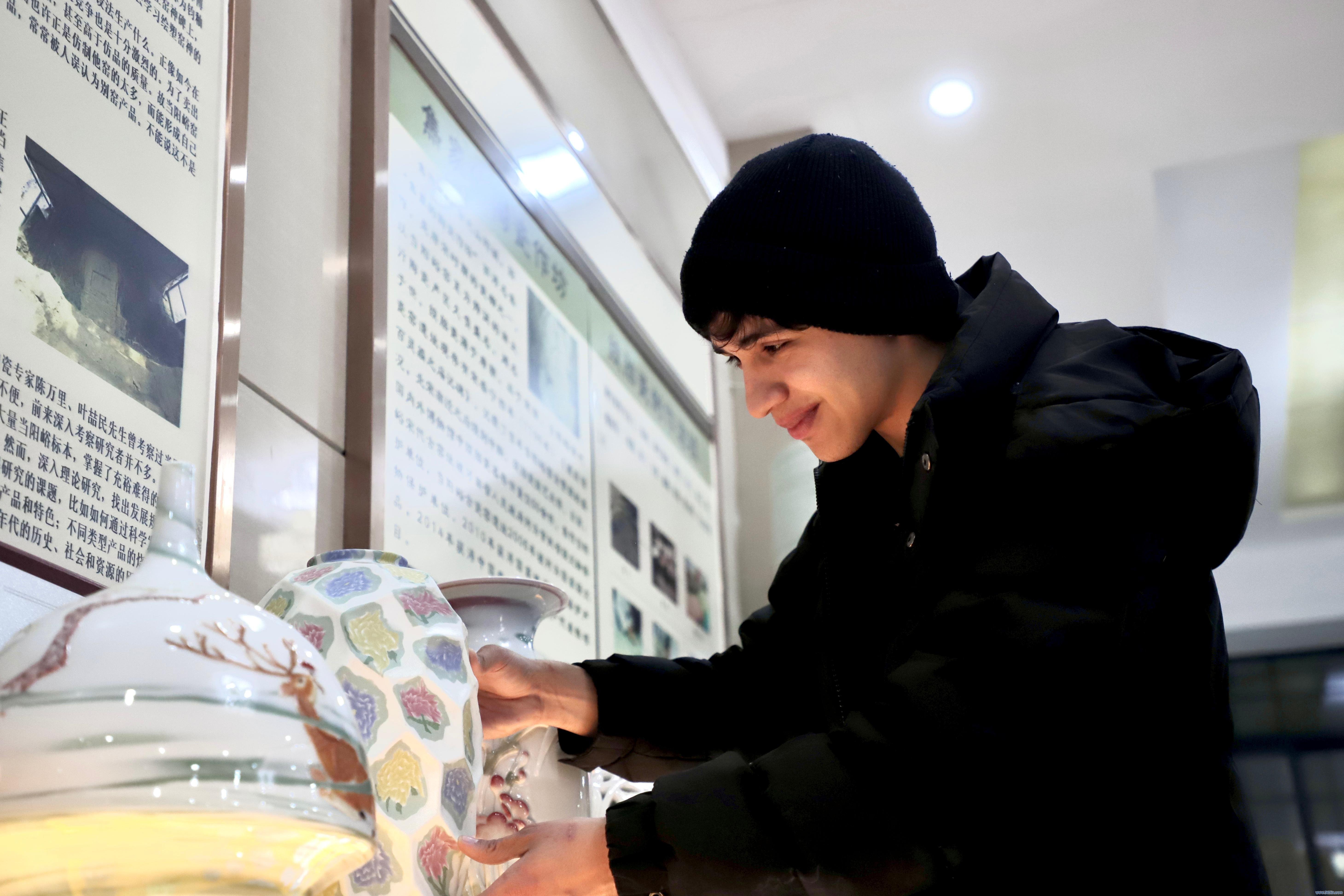图为张傲熙在焦作当阳峪绞胎瓷博物馆参不雅。